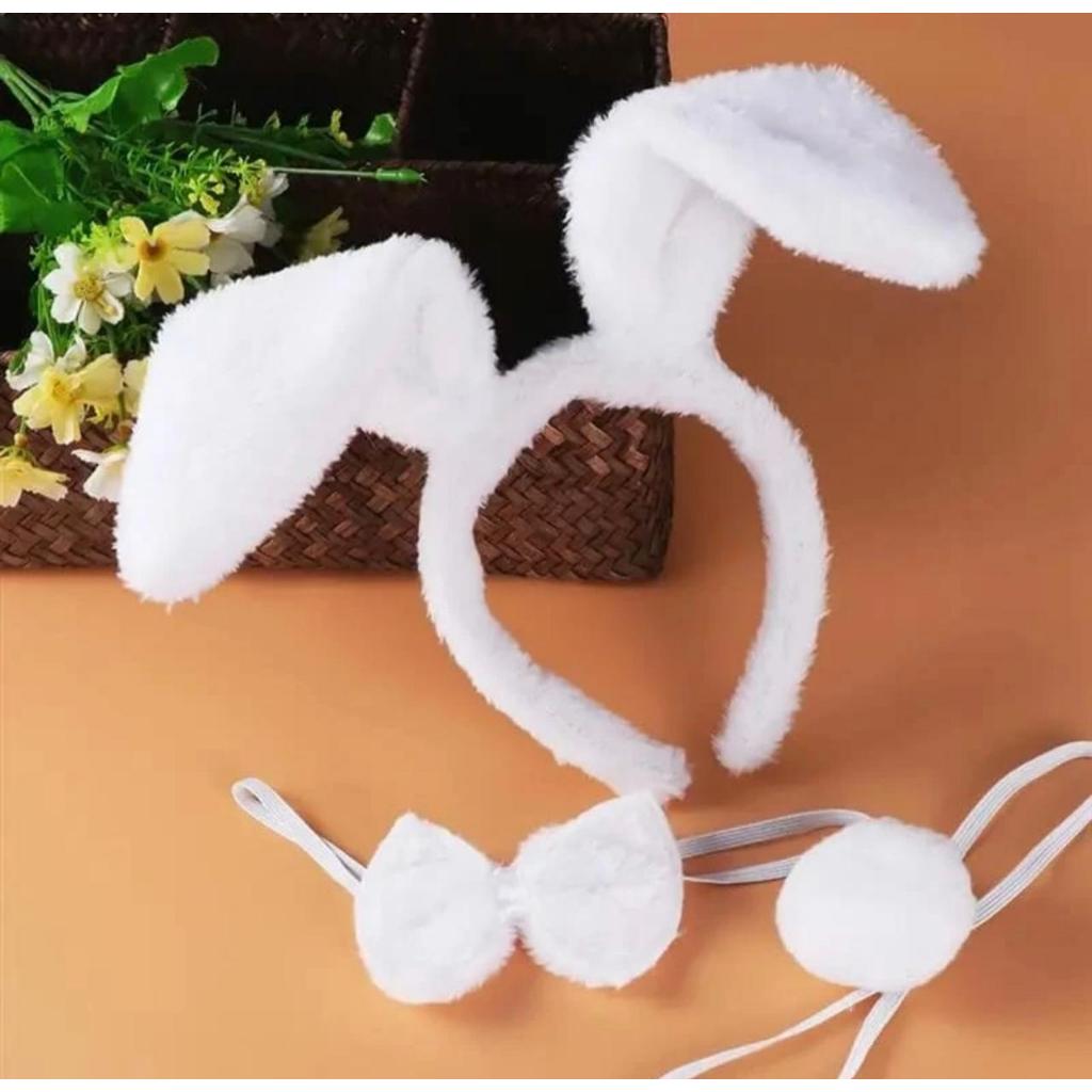 Kit Tiara Coelho Fantasia Festa Cosplay Preto Com Branco ( tiara + gravata borboleta + rabinho )