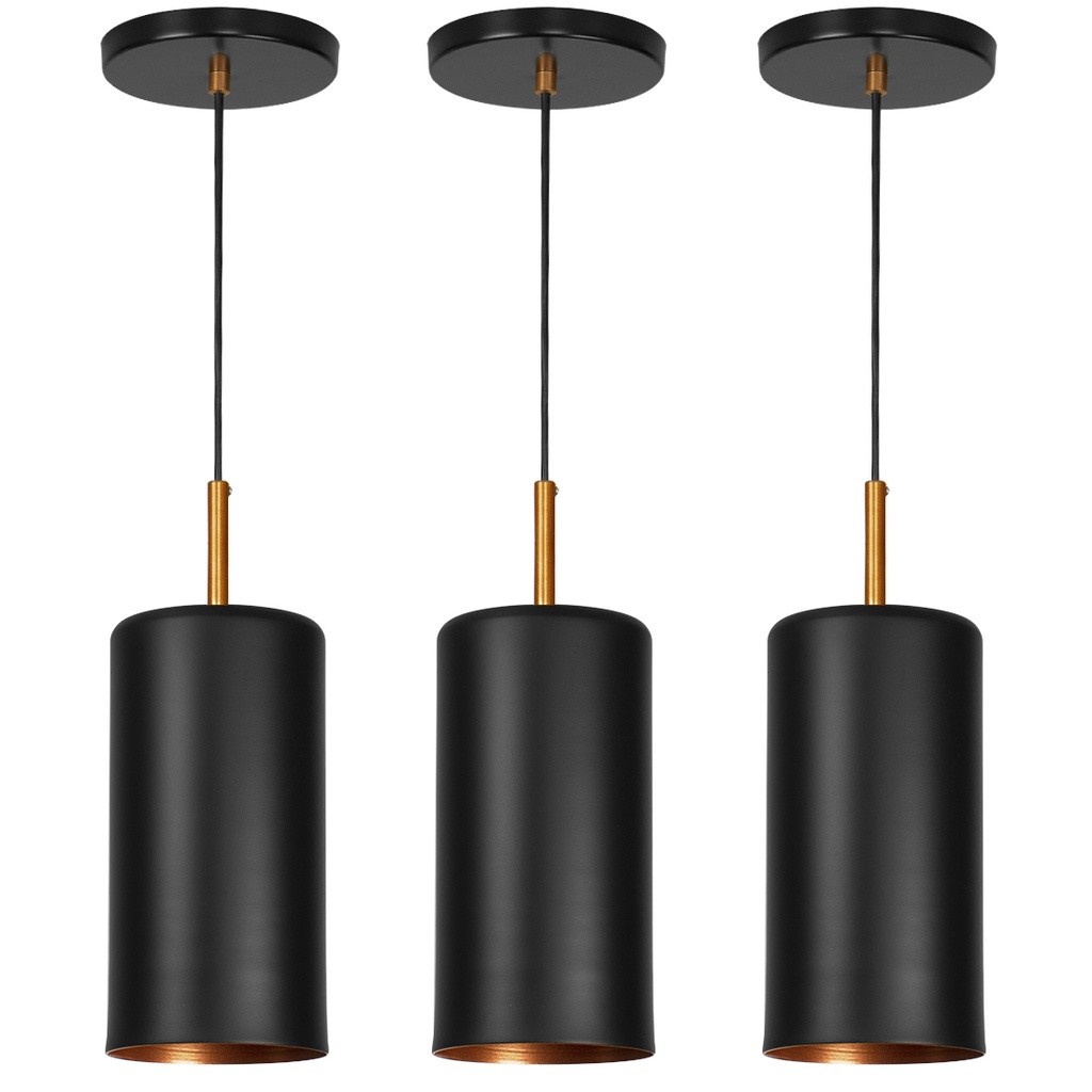 Kit 3 Lustres Pendente Bilboque Cilindrico Preto com Cobre