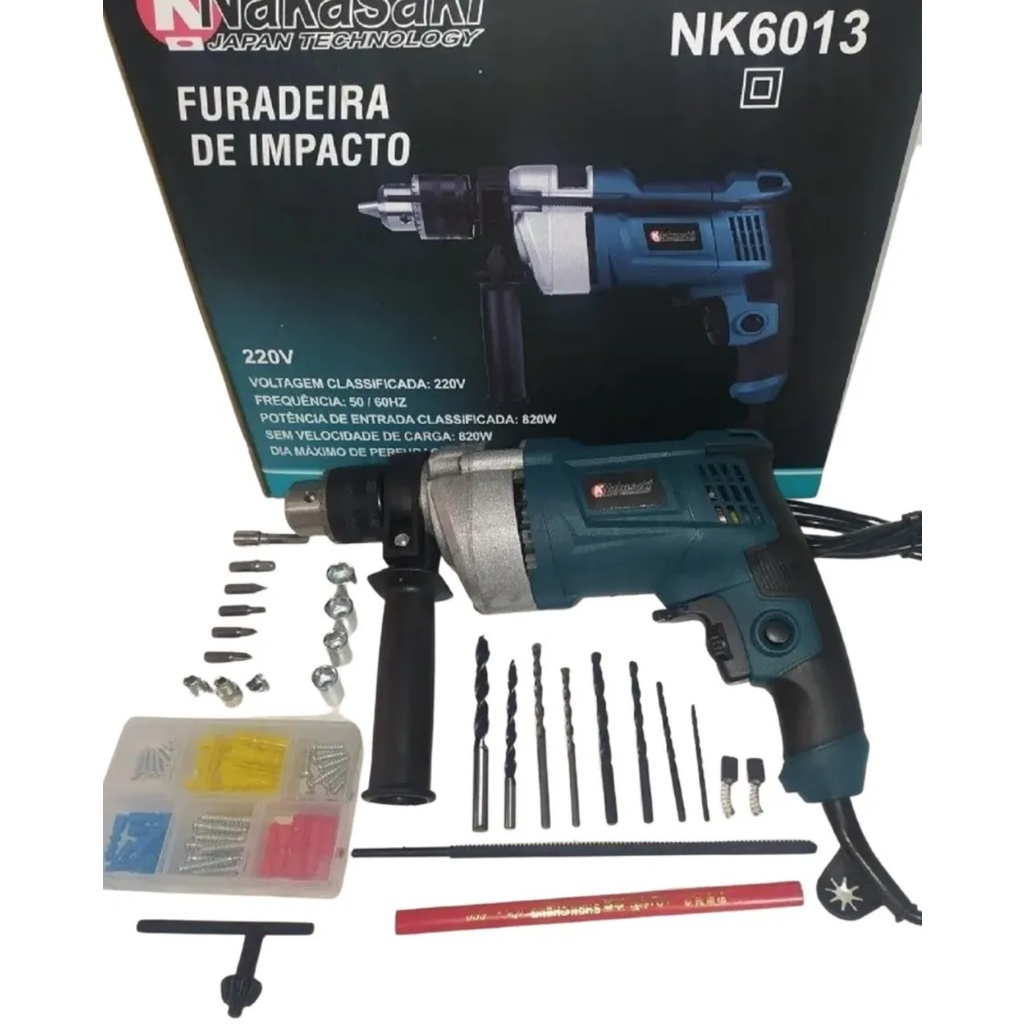 Furadeira de impacto e parafusadeira com controle de velocidade e auto reverso 820w 26pcs