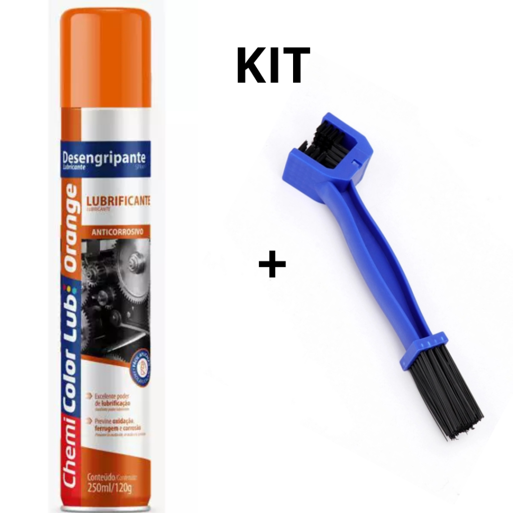Escova Limpeza Para Corrente Transmissão Moto Bike + Desengripante Óleo Antiferrugem Spray Lubrificante Multiuso Orange 250ml - Chemicolor