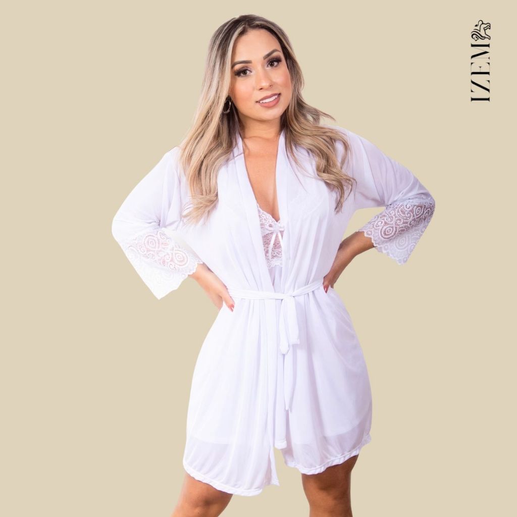 Kit de 1 Conjunto De Lingerie Luxo + 1 Robe Kimono Sensual acompanha calcinha fio Dental