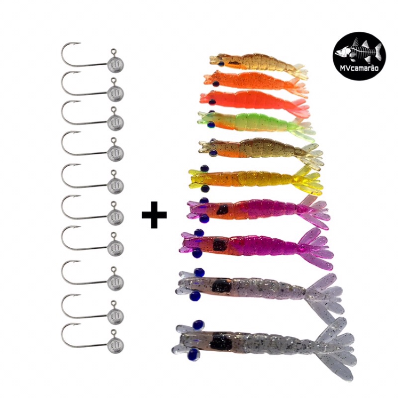 Kit 10 Camarão Artificial 7cm + 10 Jig Head - Gilany Fishing Isca Robalo Tucunare Traira Dourado Xareu Pescada Corvina