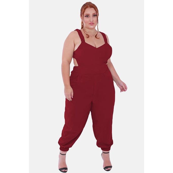 Macacao Feminino Plus Size Pantacourt Jogger Skinny com Bojo Alcas Costa Nua com Laco Cintura Alta com Elastico Forrado Soltinho Tamanhos Grandes XG EXG EXGG Festa Moda Verao