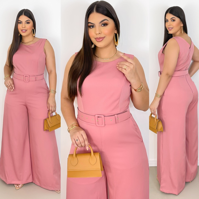 Macacão Plus Size Feminino Longo Pantalona c Cinto Corrente 0330