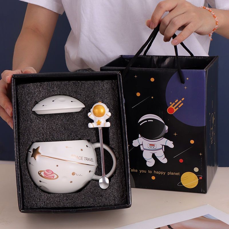 Xícara de café da manhã feminina xícara de cerâmica com caneca de tampa xícara de café da série de casais de água potável masculina Colher de astronauta bonito