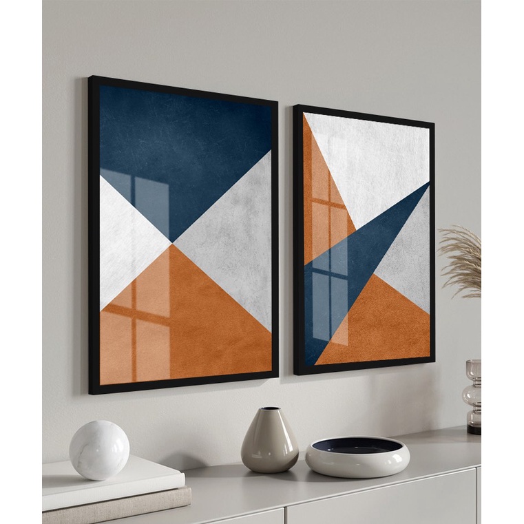 Kit De Quadros Abstrato Moderno Terracota/Azul Moldura E Vidro Para Sala Quarto