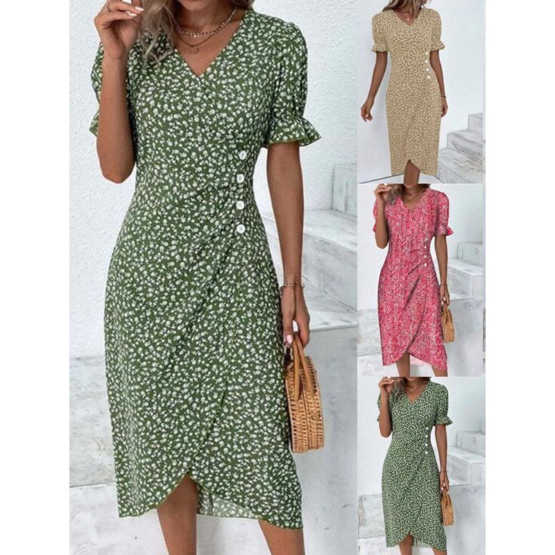 Moda Verão 2021 Vestido Feminino Com Estampa Floral De Folhas Bodycon Com Decote Em V