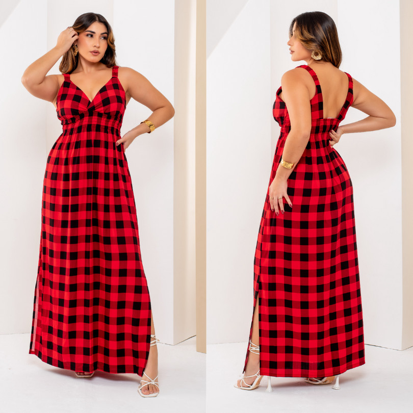 Vestido Longo Feminino em Viscolinho Alcinha com Elástico Decote V Estampa Xadrez