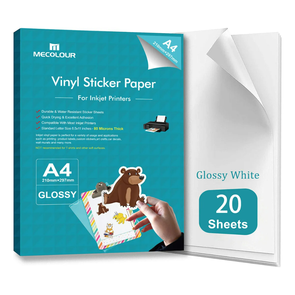 20 folhas - Vinil adesivo fotografico branco brilhante p/jato de tinta resistente a agua A4 250gr MECOLOR