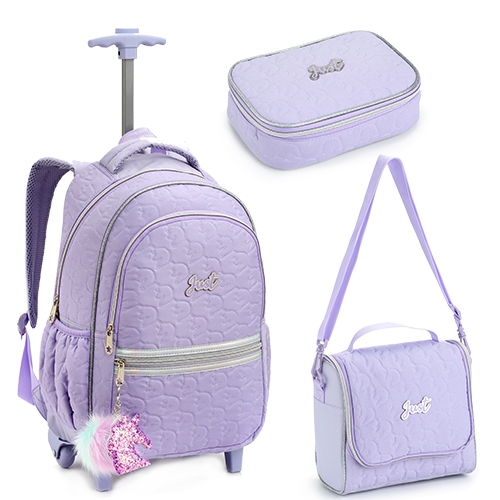 Kit Mochila de Rodinha Carrinho Escolar Lancheira Estojo Matelassê Ice Cream Teen Lilas Feminina