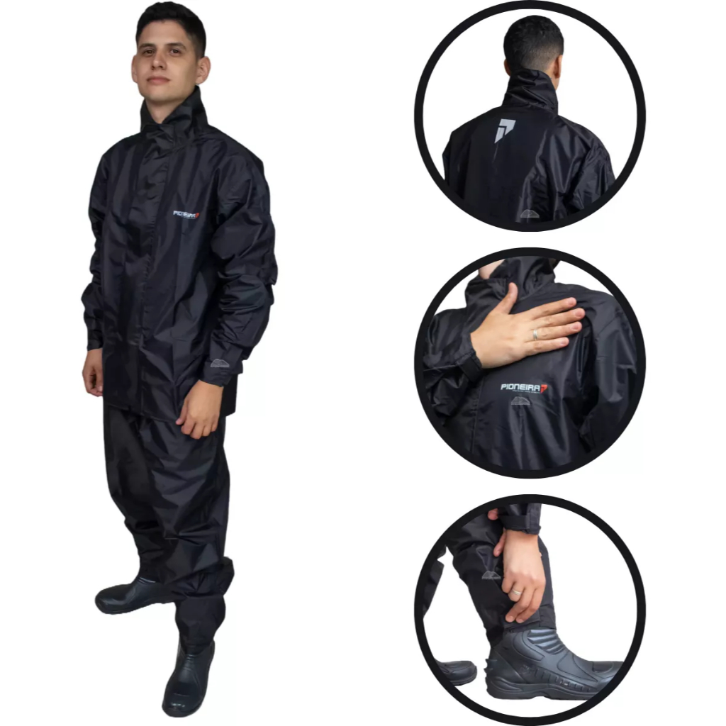Conjunto Capa De Chuva Moto PVC Preta Impermeável Combate Pioneira