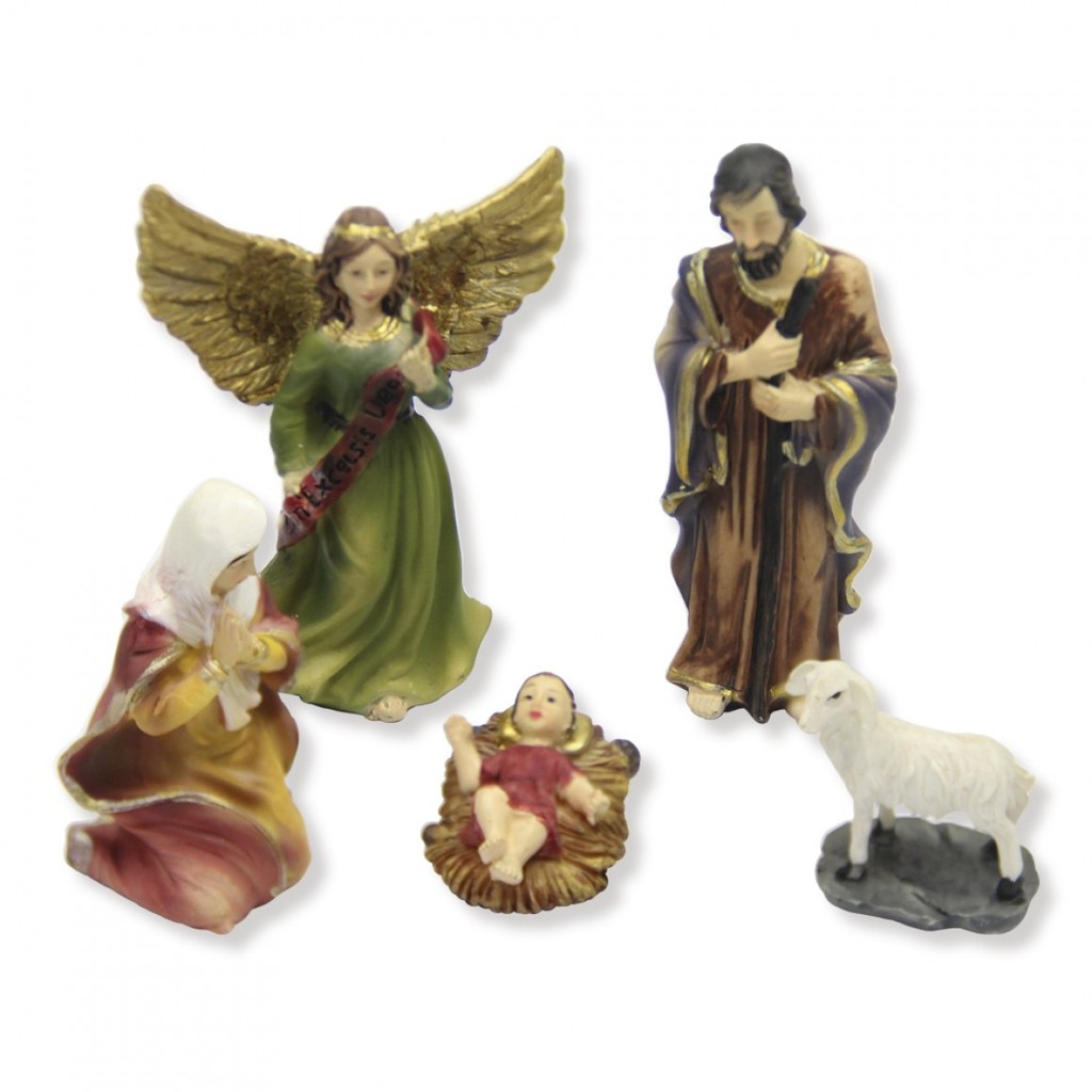 Mini Menino Jesus Na Manjedoura Presépio Em Resina 5 Peças Lembrança Natalina Figura Anjo e Sagrada Família