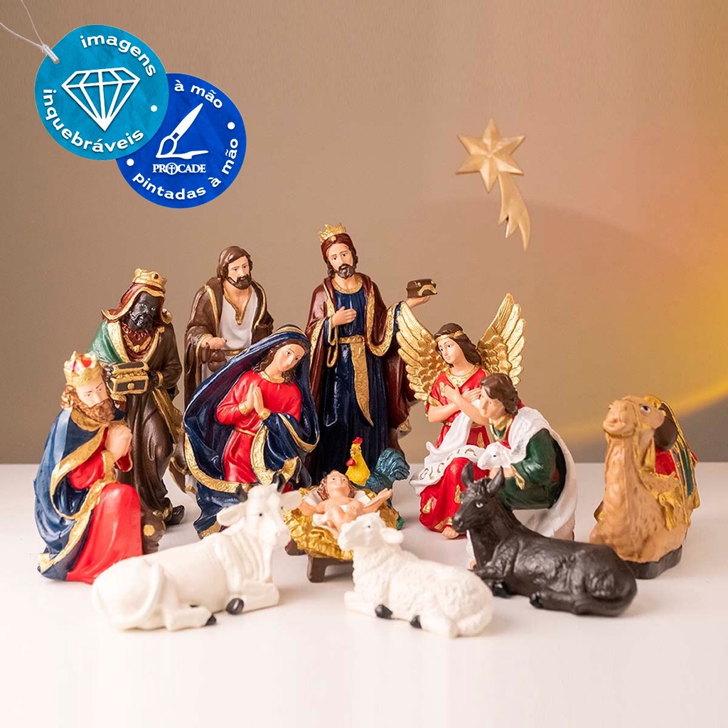 Presépio Natalino 15cm Sagrada Família Feito á mão em Resina Menino Jesus na Manjedoura Natal
