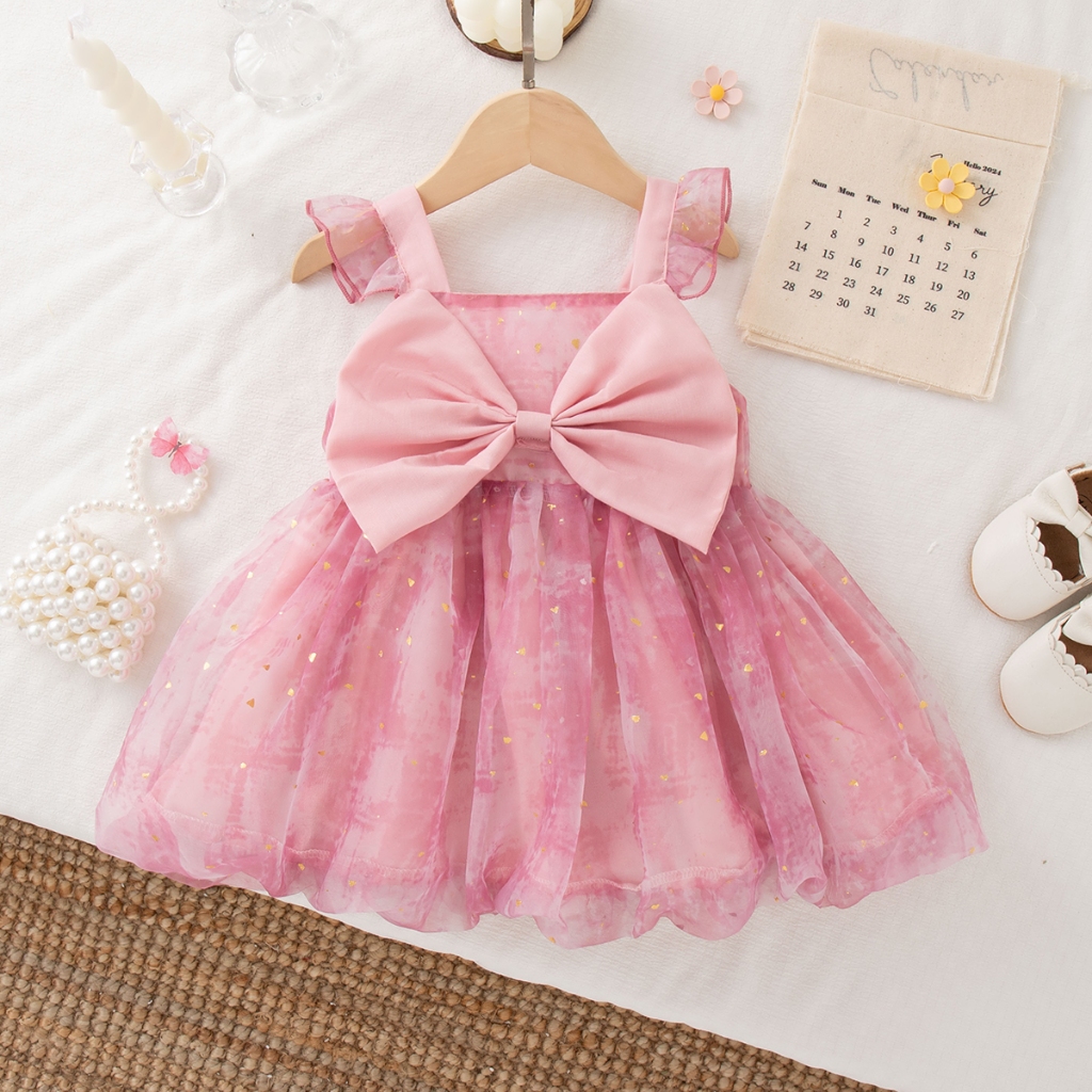 Verão Novo Doce Arco Bebê Menina Vestido De Princesa , Chiffon Pontilhado Pequenas Mangas Voadoras Roupas Infantis Para
