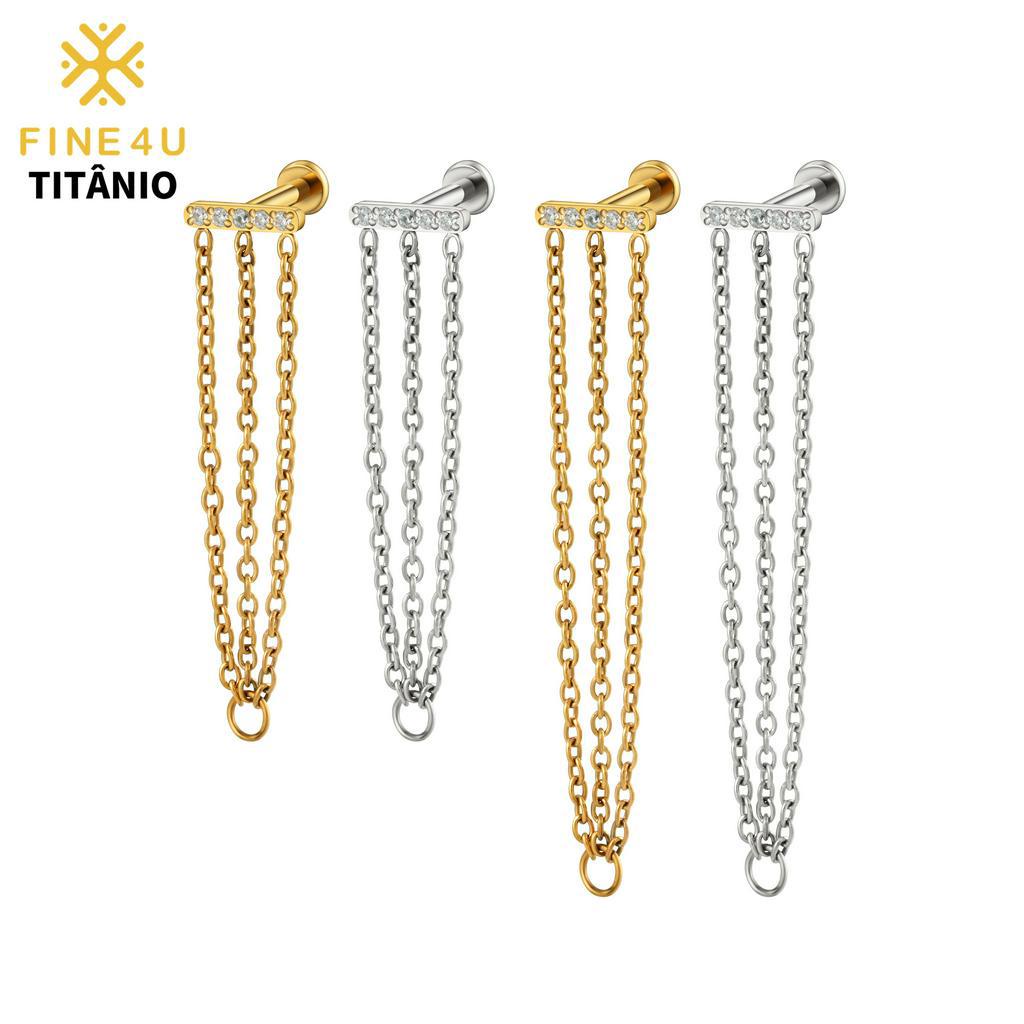FINE4U Piercing Titânio Três Cadeias Alongadas Pendão Em Forma De T Para Conch Helix Cartilagem