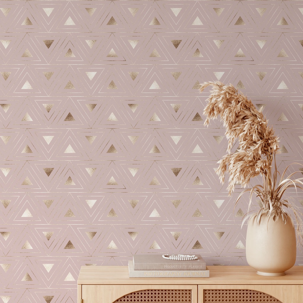 Papel de Parede Rose Dourado com Triângulos Dourados
