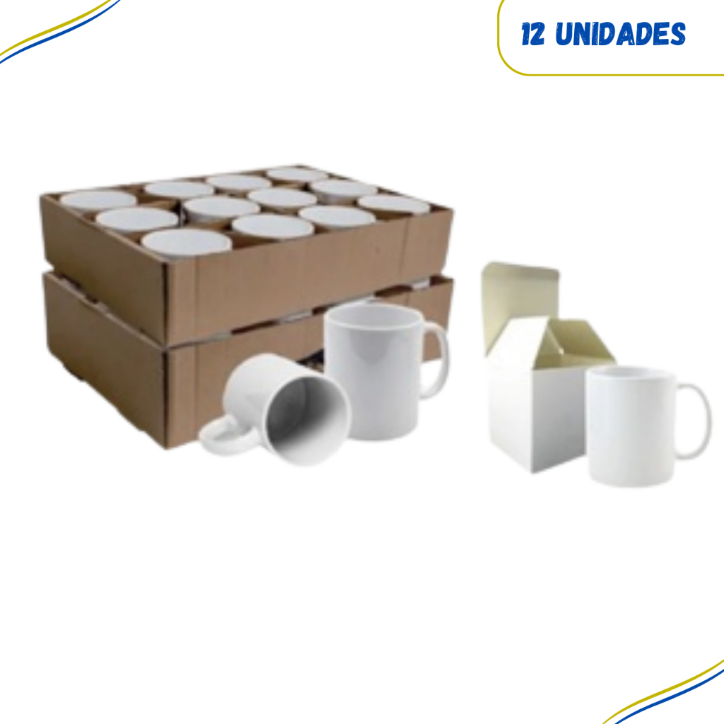 Caneca Branca de Porcelana Resinada 325ml - Para Sublimação - Pacote com 12 Unidades Com Caixinha