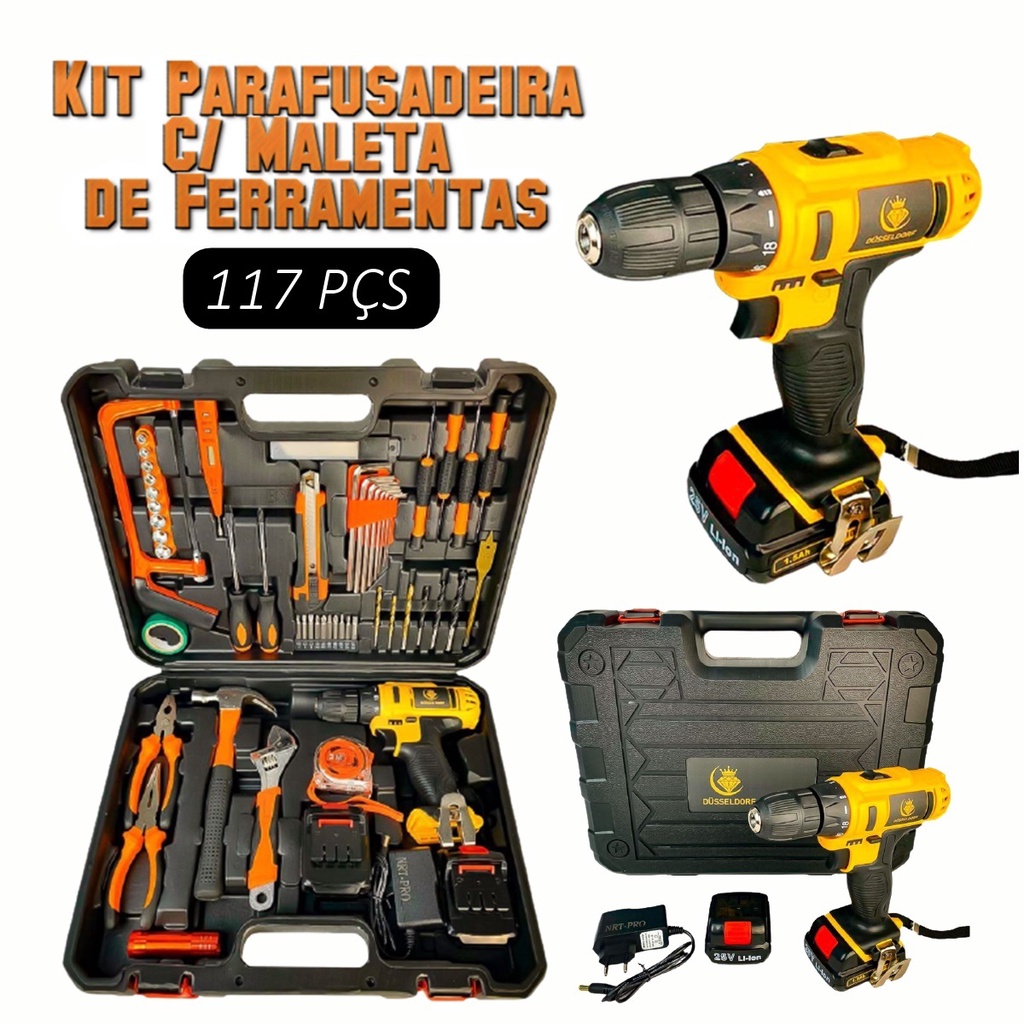 KIt Parafusadeira 2 Baterias Lítio C/ Maleta de Ferramentas 117 Peças