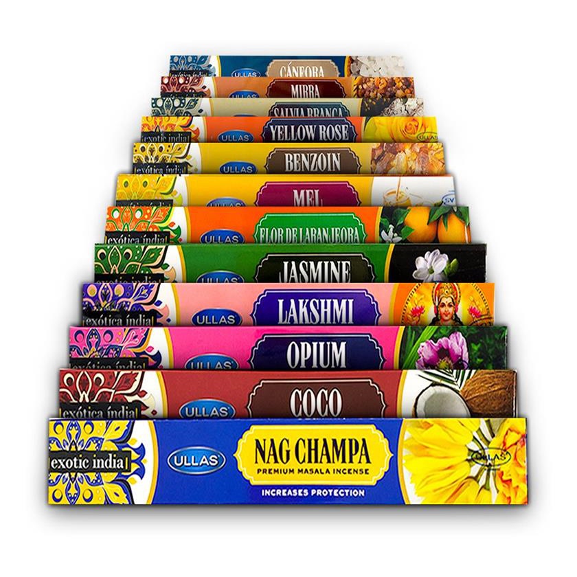 kit Incenso Indiano De Massala Ullas 12 cxs 84 VARETAS- Fragrancia Mista + PORTA INCENSO PALITO