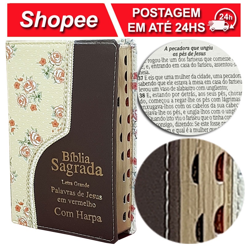 Bíblia Sagrada - Tamanho Grande - Harpa Cristã - Palavras de Jesus são em Vermelho - Duas Cores - Almeida - Capa Luxo - Índice na Lateral - Flores e Marrom
