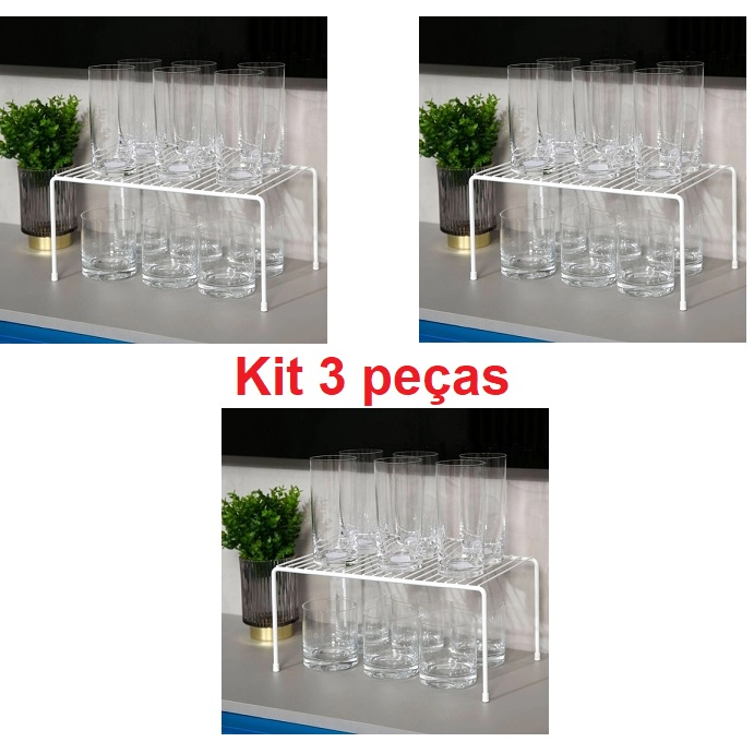 KIT 3 Organizador Suporte de Armário Cozinha Prateleira Pratos Copos Aramado Branco