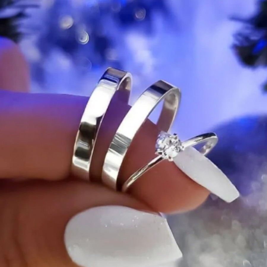 Par Aliança Reta 4mm mais 1 Anel Solitário de Aço Inoxidável