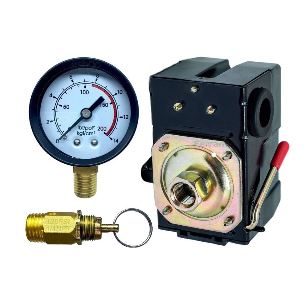 Kit Pressostato 135/175 PSI 4 Vias e Manômetro 200 LBS 1/4