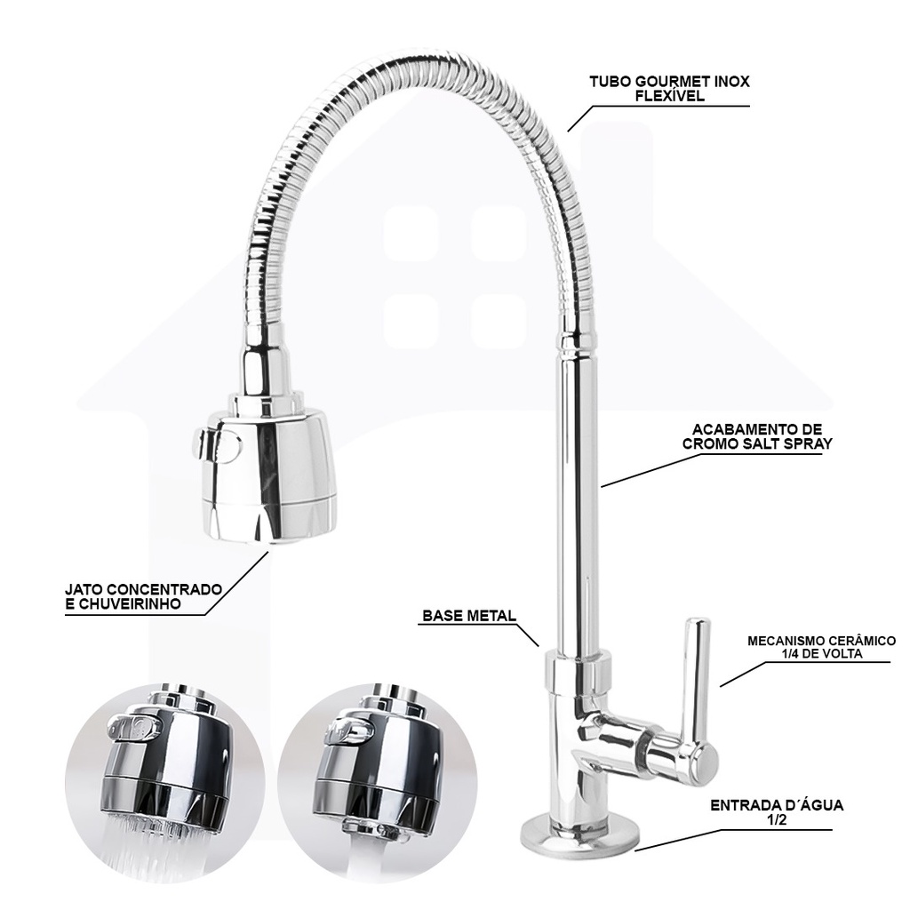 Torneira Gourmet Cozinha Bancada Pia Duplo Jato Cano Flexível Inox 1/4 de volta Cromada Abs