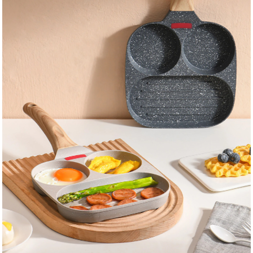 Frigideira Multifuncional Antiaderente 4 Divisórias Ovos Hambúrguer Omelete Com Alça De Madeira