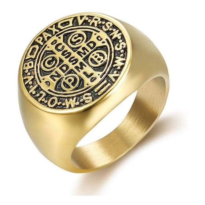 Anel São Bento Dourado Religioso Estiloso Masculino Aço Inoxidável Antialérgico