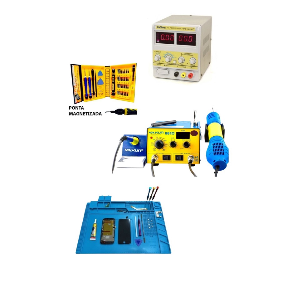 Kit Assistência fonte bancada 1502dd+15v/ jogo de chaves 38 in 1/ manta s-160/estação 881