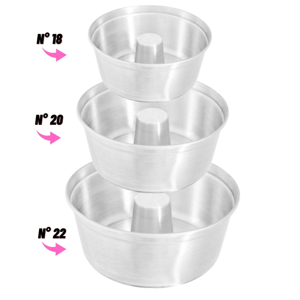 Kit 3 formas Nº 18, 20 e 22 Pudim Tubo/Cone Aluminio Bolo Vulcão Suiço com furo