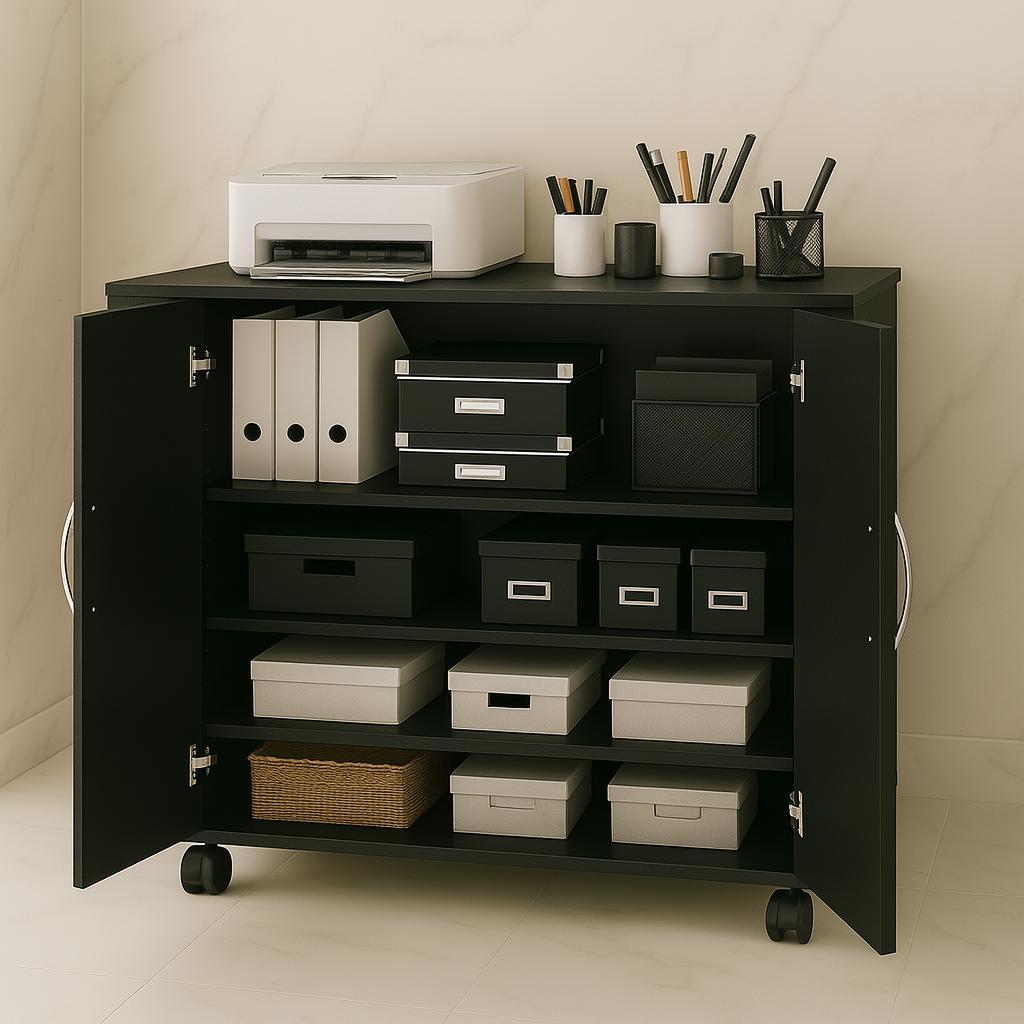 Armário Multiuso com Rodinhas e 2 Portas para Cozinha – em MDP Preto ou Branco