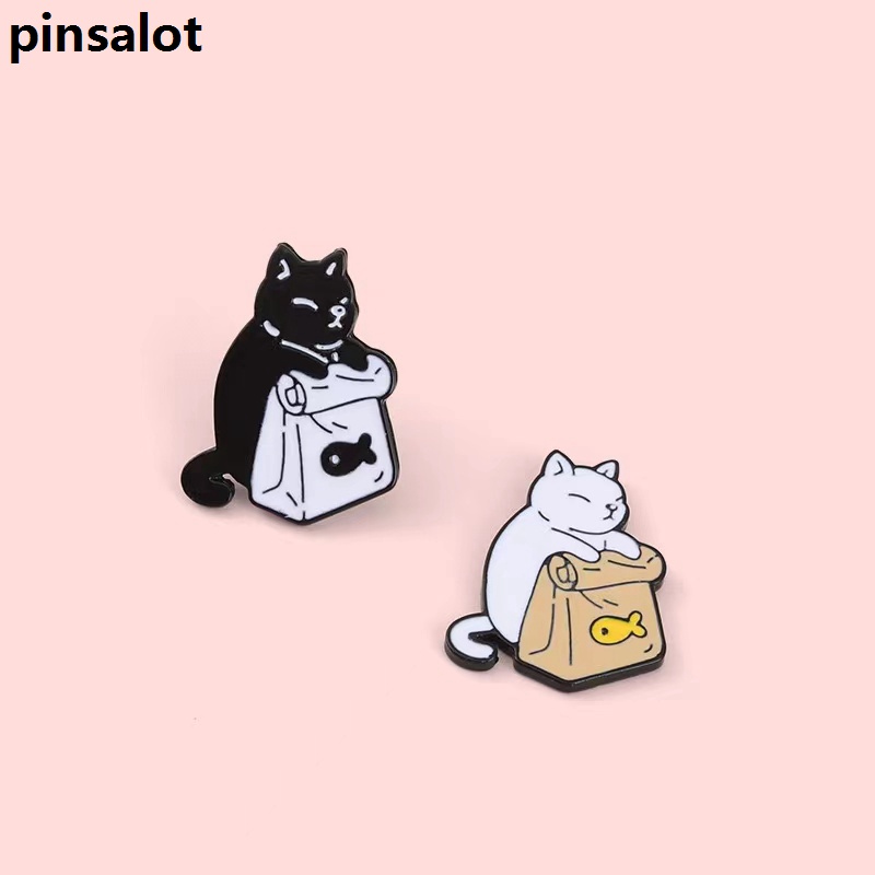 Gatinho E Peixe Esmalte Alfinetes Personalizados Branco De Comida Crachás De Lapela Para Amantes De Gato Jóias De Animais Acessórios Chapéu Atacado
