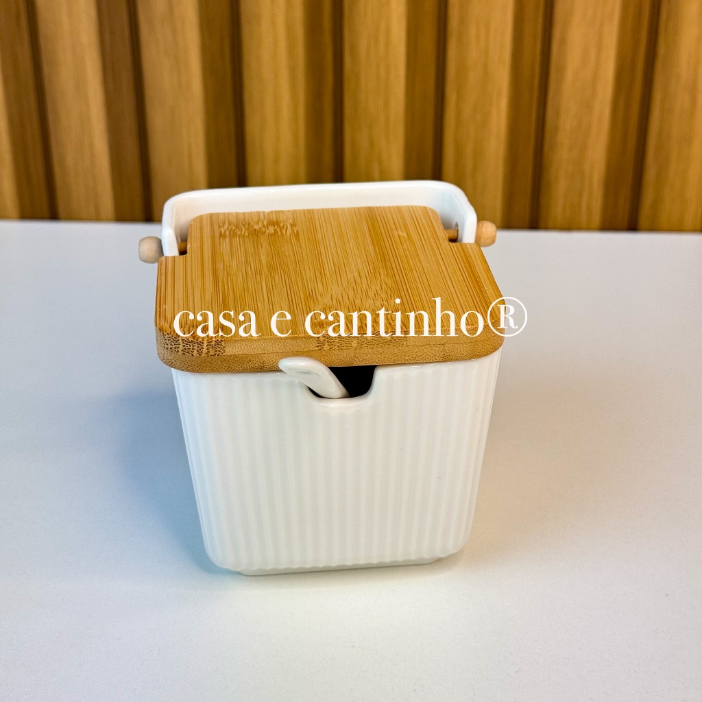 Saleiro Açucareiro Porta Sal Saleira de Mesa Cerâmica com Tampa de Bambu e Colher Decorativo