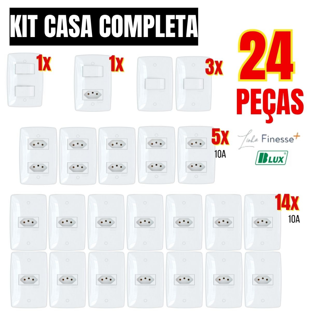 Kit 15 Peças Casa Completa 4x2 Blux Finesse + Tomada 10A 20A Interruptor Simples Luz casa Dupla Duplo 1 seção 2 seções Branco Combo Economico