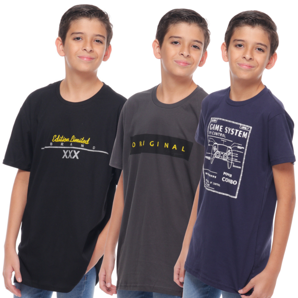 Kit 3 Blusas / Camisas Manga Curta Infantil e Juvenil de malha - Várias cores e estampas - 2 ao 16 anos - Confortável, Básico