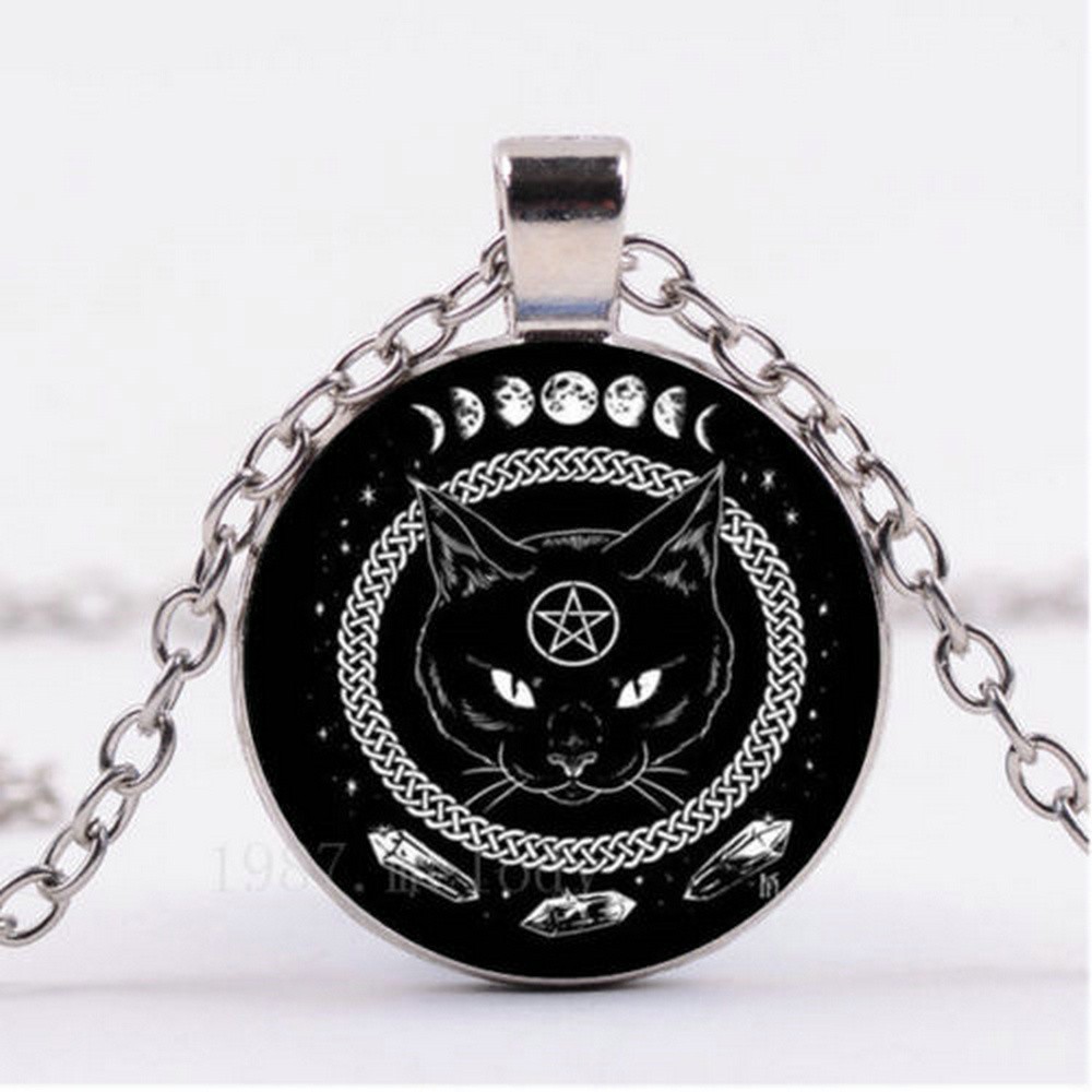 Cabochon Colar De Vidro Prata / Bronze / Pingente Preto (Pentagrama Gato Preto)