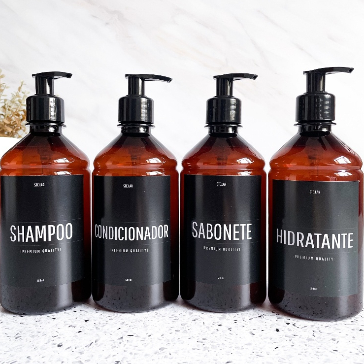 FRASCO ÂMBAR 4 PÇS 500ML KIT BANHEIRO SHAMPOO CONDICIONADOR SABONETE HIDRATANTE