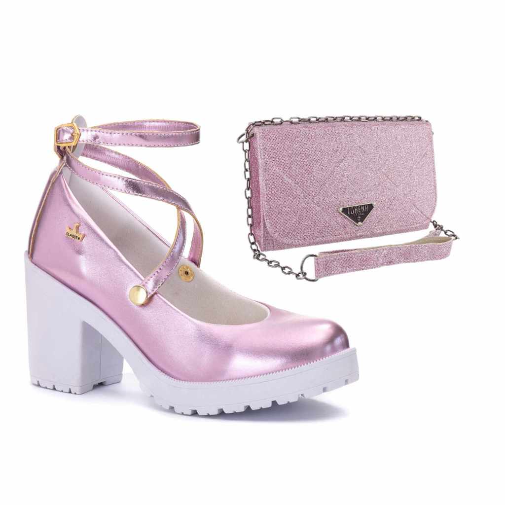 Kit Sandália Feminina Salto Tratorado e Bolsa Festa Blogueirinha Balada Rosa