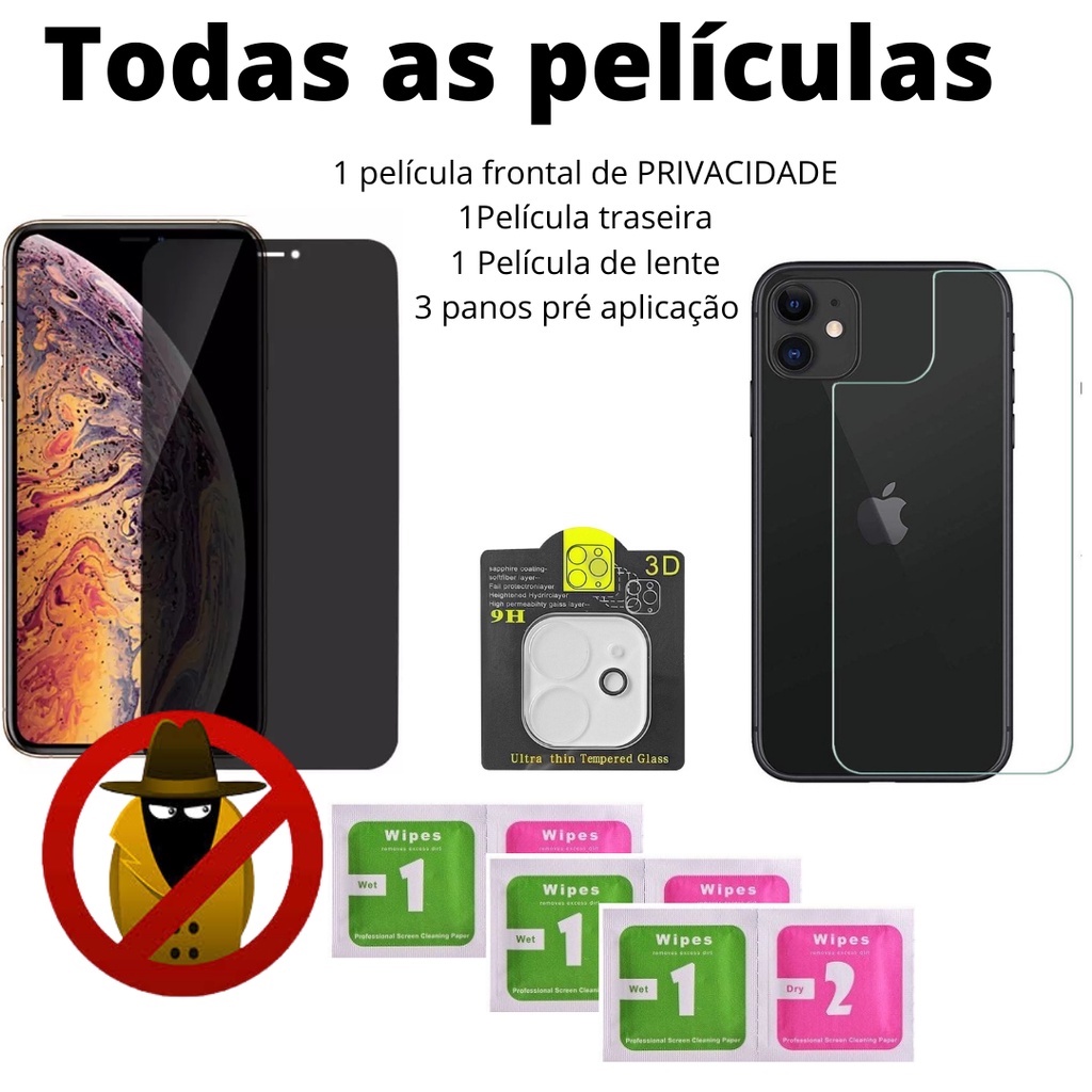 Películas Frontal Privacidade de vidro 3D IPhone 11, 12, 13, 14, 15 + Película Traseira + Película da Lente da câmera