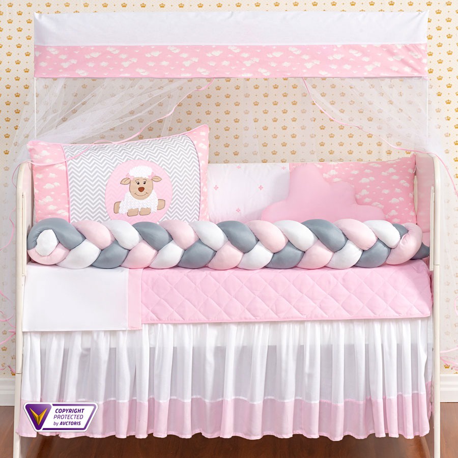 Kit Protetor Berço Completo 10 Peças + Saia Brinde Padrão Nacional e Americano Modelo Cristal Menina Rosa - Promoção