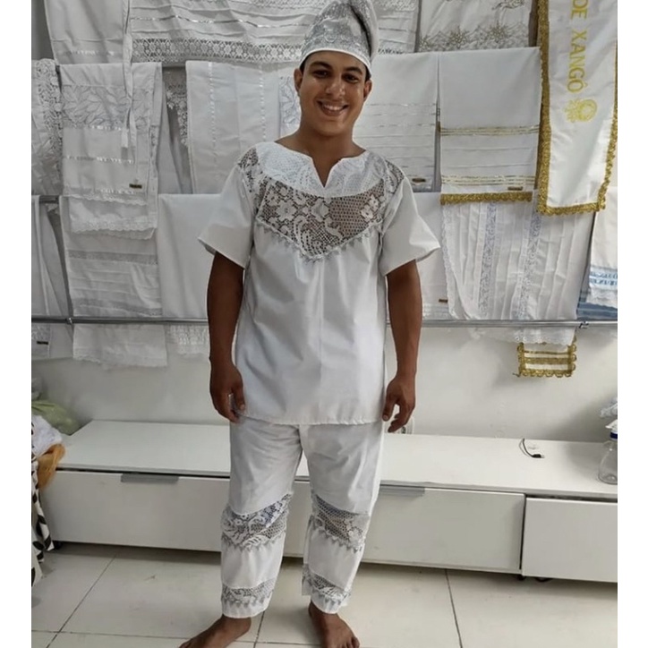 Conjunto masculino de renda branco Candomblé e Umbanda roupa de Santo