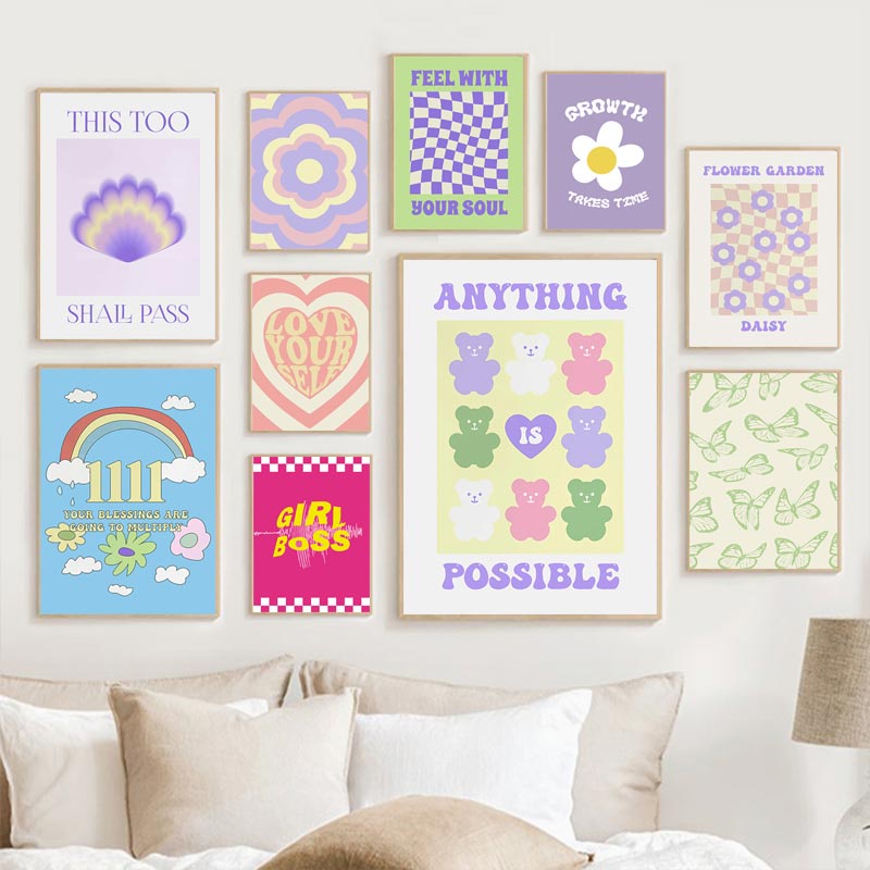 Abstrato Pôster Em Tela Pastel Dinamarquês E Estampa De Xadrez Smiley Pintura De Flores Estética Decoração De Arte De Parede Do Quarto