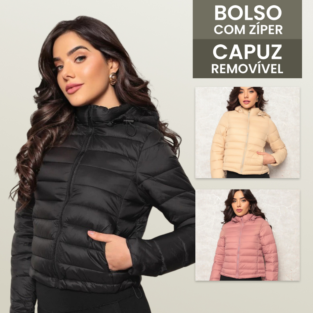 Jaqueta Feminina Bobojaco Nylon Puffer com capuz removível .Jaqueta Forrada Peluciada com capuz removível