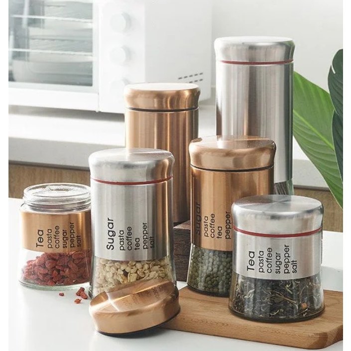 Kit 2 Potes de Vidro Tampa Rose Gold Porta Mantimento Café Açúcar Chá Grãos Cookie Armazenamento