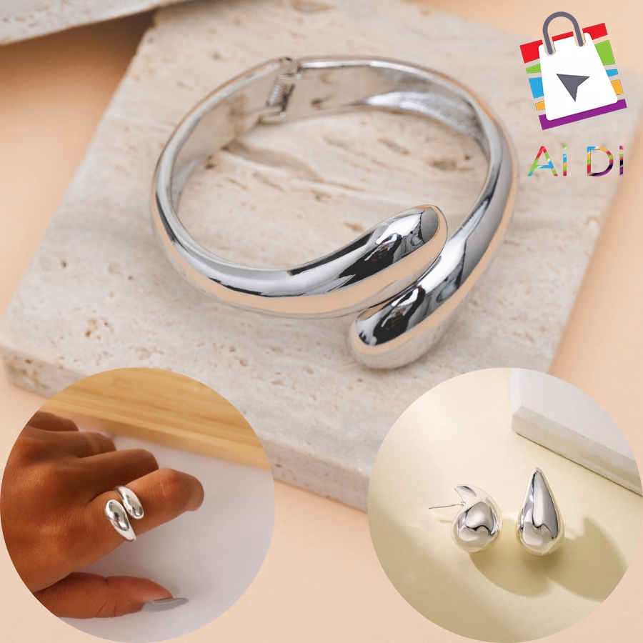 Conjunto de Pulseira, Anel e Brincos em Prata com Design de Gota de Água Estilo Exagerado e Elegante