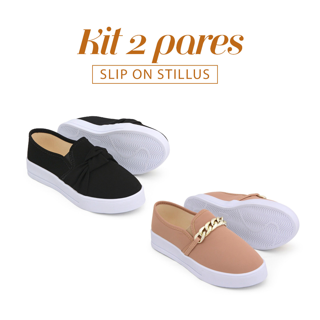 Kit 2 pares Tênis Feminino Premium Casual Iate Slip On Stillus Calce Facil confortável Laço e Corrente