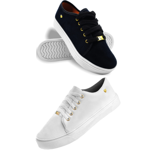 Kit 2 Tênis Feminino Ping Coração Branco Preto Confort Casual Confortável Slip On
