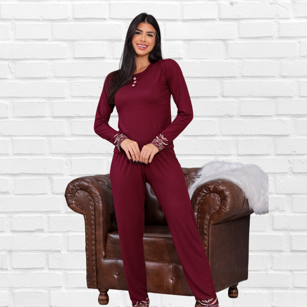 Pijama Feminino Longo Confortável Malha Canelada Manga longa